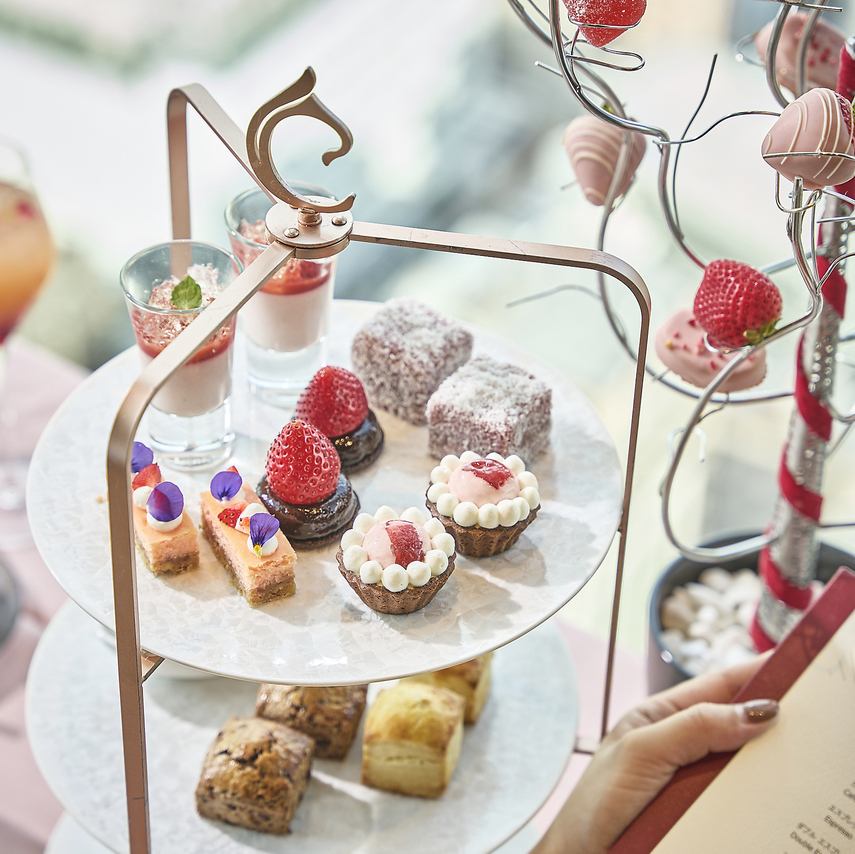 チョコレートタルトに苺のムースとコンポートを重ねた贅沢なタルトや、クリーミーな苺パンナコッタ、苺の香りをプラスしたNYチーズケーキに加え、今流行中のラミントンまで加えた大満足のアフタヌーンティーです